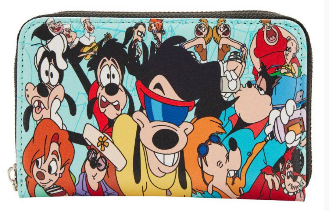 The Loungefly A Goofy Movie Moments Zip Around Wallet is made of vegan leather (polyurethane). Wallet zips closed, has sturdy metal hardware, and features printed details. Take note of the coordinating inside lining.