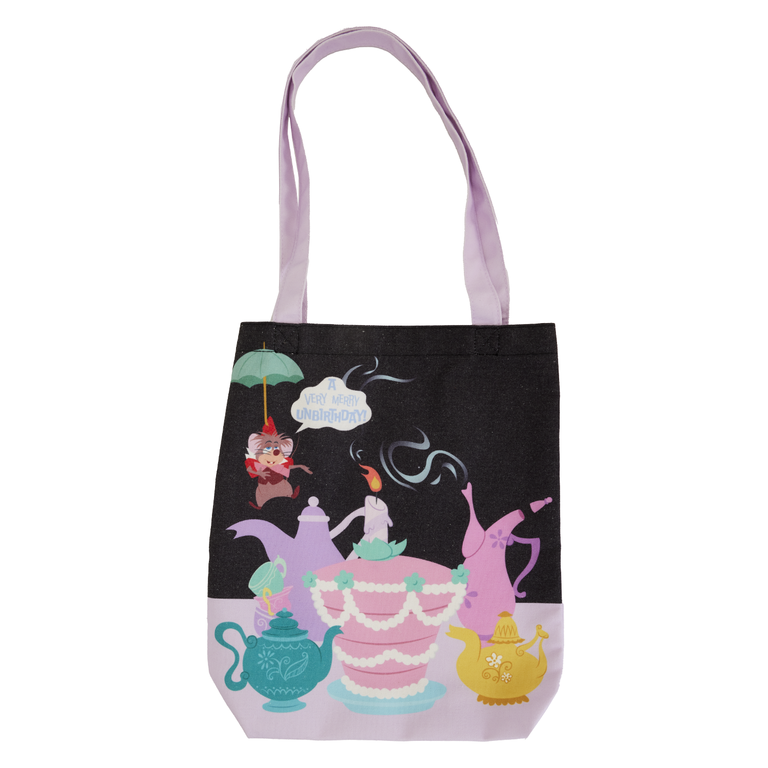 Big plans for an unbirthday bash? Take along everything you need to enjoy your day with our roomy Loungefly Disney Alice in Wonderland Unbirthday Canvas Tote Bag. On the front, a colorful table is set! A black background makes the colors of the unbirthday party setting pop. Disney's sleepy Dormouse floats down to the table with his umbrella. A message printed beside him reads, "A very merry unbirthday." In the middle of the set table, there's a frosted pink cake with a candle. Teapots appear in various colors, along with a stack of teacups. The back is a delightful frosting pink color, and a sturdy handle adds convenience. Commemorate your unbirthday in style!