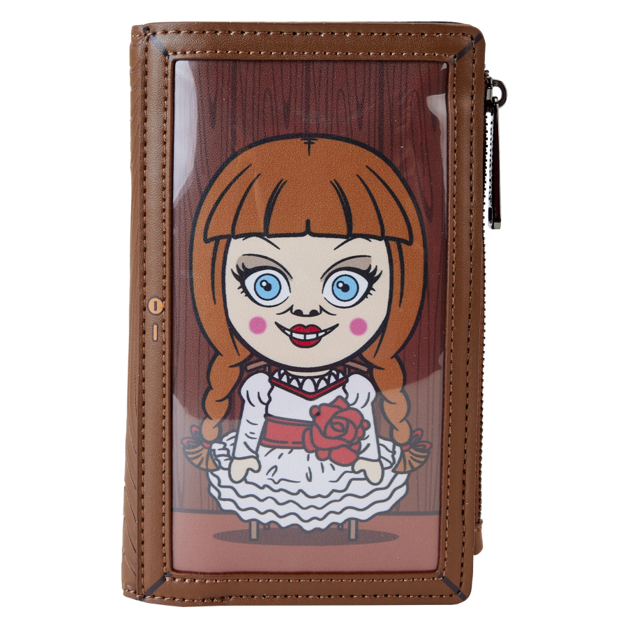 Doll up your wardrobe with the loungefly Annabelle Cosplay Bifold Wallet. This hauntingly fashionable accessory features a clear PVC "window case" on the front, through which you can see an applique of Annabelle, as if she were locked inside for safekeeping. Wood grain debossed details carry over onto the back of the wallet.