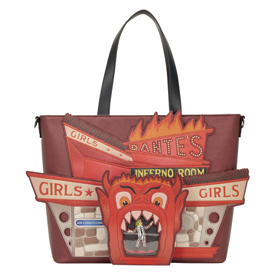 A bag that can hold all your essentials AND rep one of your fav films? Oh, yes! This tote bag features Dante's Inferno Room on the front, highlighted with metallic faux leather and debossed details. A removable coin bag can slot in the space with the front doors to show Beetlejuice standing at the entrance. This is a fun statement piece to show your love for Beetlejuice all season long! Features Faux leather (polyurethane) Removable coin bag Adjustable crossbody strap Applique, debossed, metallic faux leather, and printed details Coordinating interior lining Dimensions: 15" W x 9.5" H x 5" D 38cm W x 22.8cm H x 12.7cm D This is an officially licensed Warner Bros. product.