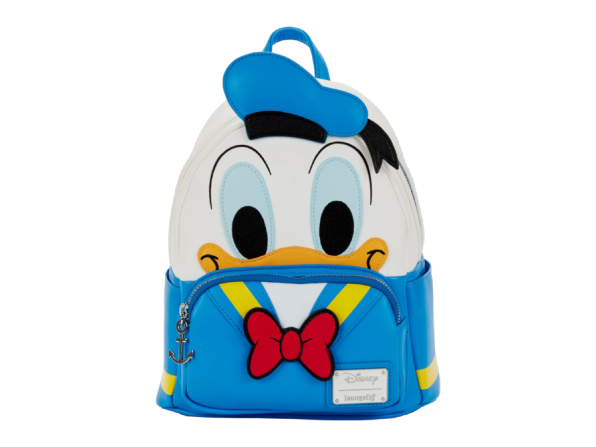 Donald Duck is coming in for a landing to ride with you on your next adventures with this Donald Duck Cosplay Mini Backpack. On the front of the bag, Donald Duck �s face peeks out over the front zipped compartment, which is accented by a bright red bow, with 3D details. The message on the back reads "Aw, Phooey!" This backpack is a great accent for any Disney outfit.
