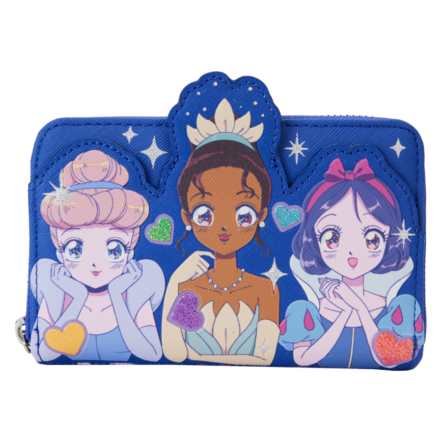 Star-struck by magical stories? Get drawn into our Loungefly Disney Princess Manga Style Zip-Around Wallet. This royal blue accessory features Disney Princess characters in quintessential manga style, wide-eyed and full of wonder. On the front, a die-cut applique print of various Disney Princess characters appears, including Cinderella, Tiana, and Snow White. Colorful glittery hearts surround them, along with silver "starbursts" and diamonds. On the back, the glitter hearts and silver details surround Disney's Belle and Ariel. Inside, you'll find four slots for holding cards and one clear slot for displaying your ID. A die-cut shape of a heart, on the clear slot, adds a lovely touch. Secure your valuables for the day and embrace all kinds of adventures.
