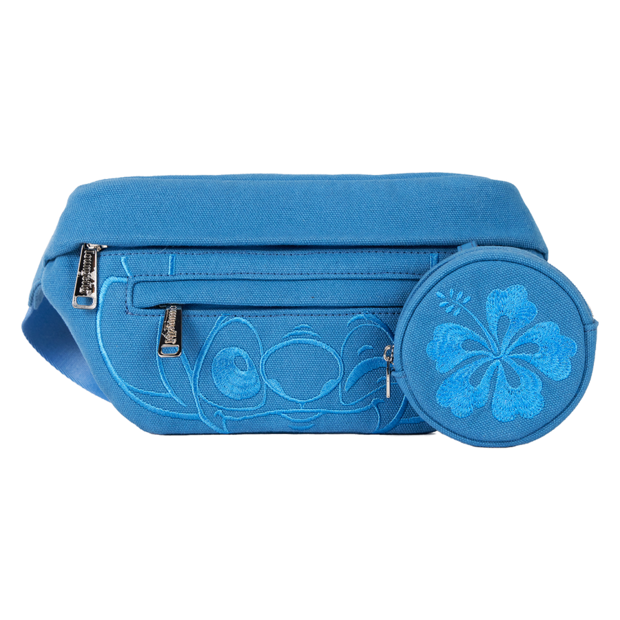 Making a quick escape with stylish, mischievous flair? You've got this! Take along this belt bag featuring Disney's Stitch. Show off your fandom discreetly while making a clean getaway in style with this all-over blue accessory. On the front, Stitch's face appears as a blue embroidered outline - and he's winking. A smaller front pocket helps you secure smaller items on your journeys, and a removable, reversible coin bag featuring Stitch on one side and a tropical flower on the other, creates a convenient way for you to organize smaller belongings. There's just enough room to pack your daily essentials and take off on fun-filled adventures.