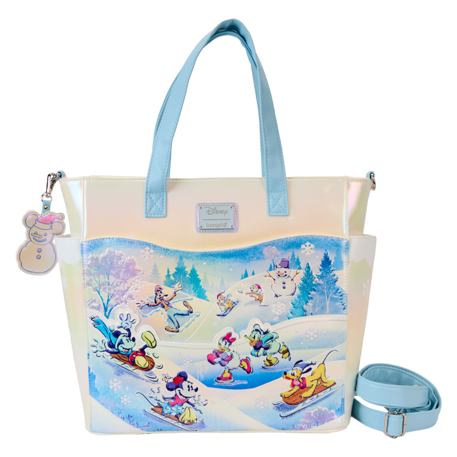 Join Mickey and his pals as they explore the wonders of winter. Frosted with iridescent details, this convertible tote bag uses an icy colorway for the characters we know and love. With backpack straps, a shoulder strap, and handles, this bag can be worn however you choose!