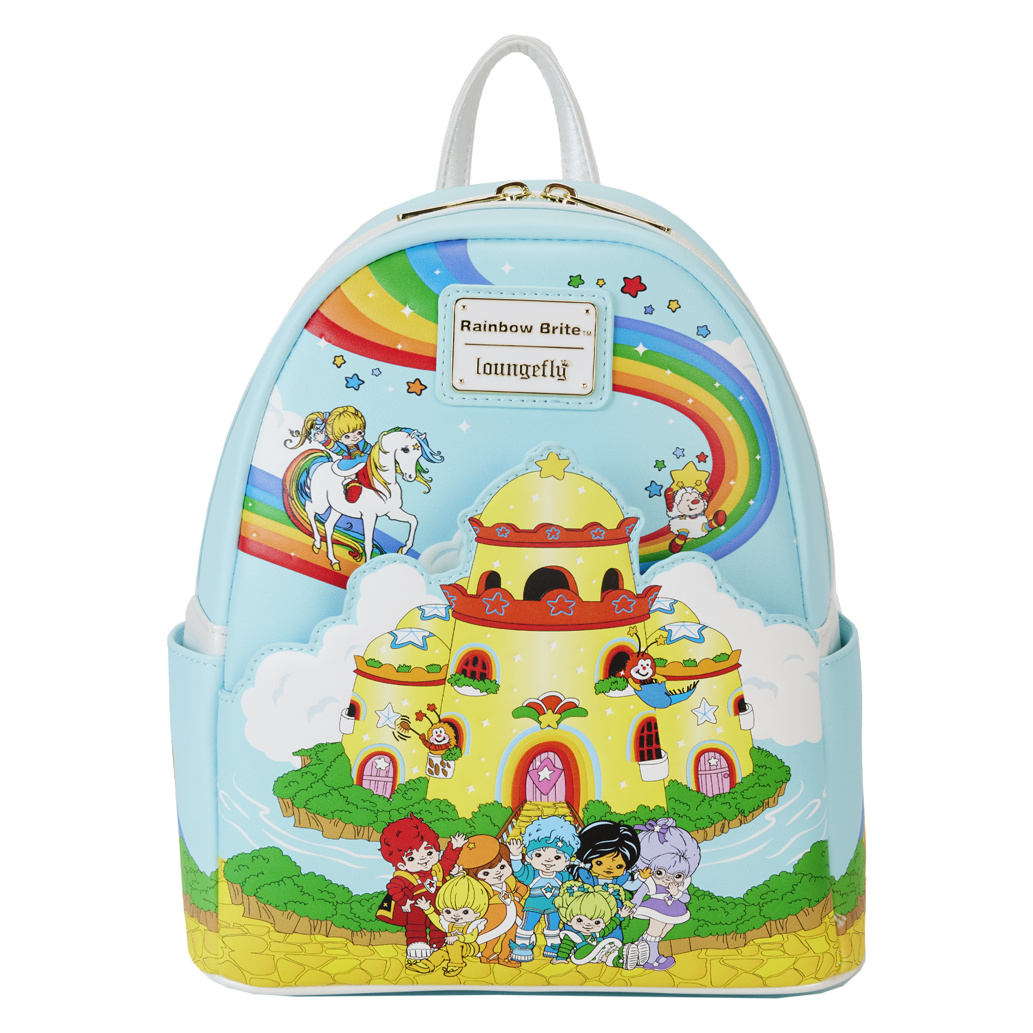 The Loungefly Rainbow Brite Castle Group Mini Backpack is made of vegan leather (polyurethane) with glitter trim. Bag has adjustable shoulder straps and shiny gold hardware. Additional features include applique, embossed, and printed details. Take note of the coordinating inside lining.