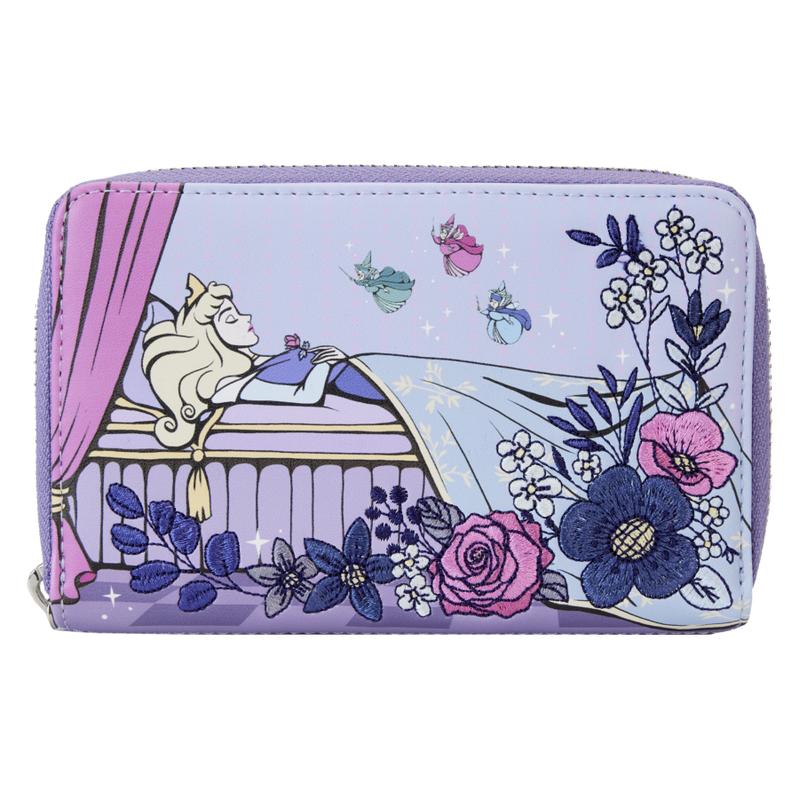 No need to prick your finger on a spinning wheel, this collection is a dream come true! Step into the timeless tale of Disney's animated classic with the Loungefly Sleeping Beauty 65th Anniversary Zip Around Wallet. Embroidered flowers frame the front of this accessory, where Flora, Fauna, and Merryweather watch over Aurora as she sleeps. A quote from Aurora's storybook appears on the back. Open the wallet to reveal five slots for holding cards and a clear slot for ID, which includes a die-cut window in the shape of Aurora's crown. This accessory makes a spellbinding addition to any outing and is perfect for fans looking to keep their favorite characters close.