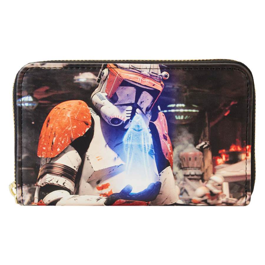 The Loungefly Star Wars: Episode III - Revenge of the Sith Scene Zip Around Wallet features cinematic moments from the legendary finale of the prequel trilogy. On the front, a commander receives a deathly order. On the back, Darth Vader consults his master. With four slots for holding cards and a clear slot for ID, this accessory makes a stellar addition to any Star Wars collection.