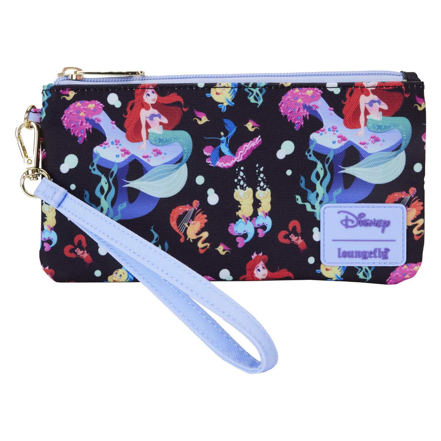 A symphonic sensation, created by a memorable crustacean, is close at hand! Strike up the band and swim home with our colorful Loungefly Disney The Little Mermaid 35th Anniversary "Life is the Bubbles" All-Over-Print Nylon Wristlet Wallet. This brilliant accessory incorporates an all-over-pattern of the "Under the Sea" moment, where Disney's Sebastian takes center stage. The black background makes the colors and original artwork pop. In the pattern, you might see Disney's Ariel seated on a rock under the sea, Sebastian singing, delightful seahorses, a carp with a harp, bass with brass, Flounder, aquatic plants, a blue crustacean playing pink clamshell drums, and bubbles. Light periwinkle trim adds a complementary color as well. The convenient wristlet strap matches the trim. Inside, you'll find approximately four slots for securing and holding cards. Bring the music and favorite movie memories wherever you go to celebrate the 35th anniversary of The Little Mermaid in style.