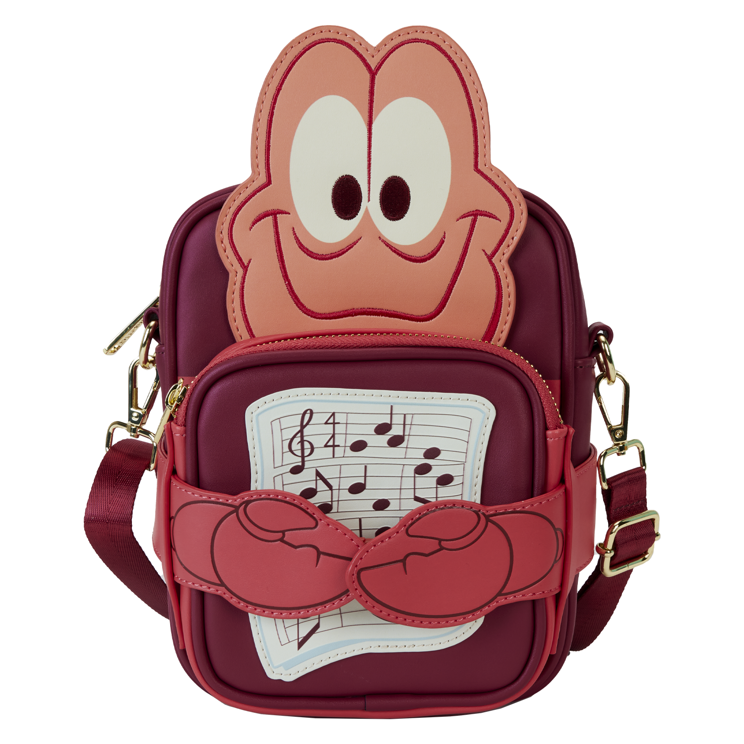 Strike up the underwater band in style! Our Loungefly Disney The Little Mermaid 35th Anniversary Sebastian Crossbuddies® Bag is ready for a spectacular show. This passport-style bag features Disney's Sebastian, his applique face rising up over the top. His claws, which double as a clasp, embrace a detachable coin bag. One side of the coin bag displays a sheet of music, and on the other side, a delightful seahorse swims among the bubbles. You can change up your look while securing smaller items throughout all your journeys. An adjustable and detachable strap adds extra convenience. Carry along your favorite movie moments wherever you go and celebrate the 35th anniversary of The Little Mermaid in style.