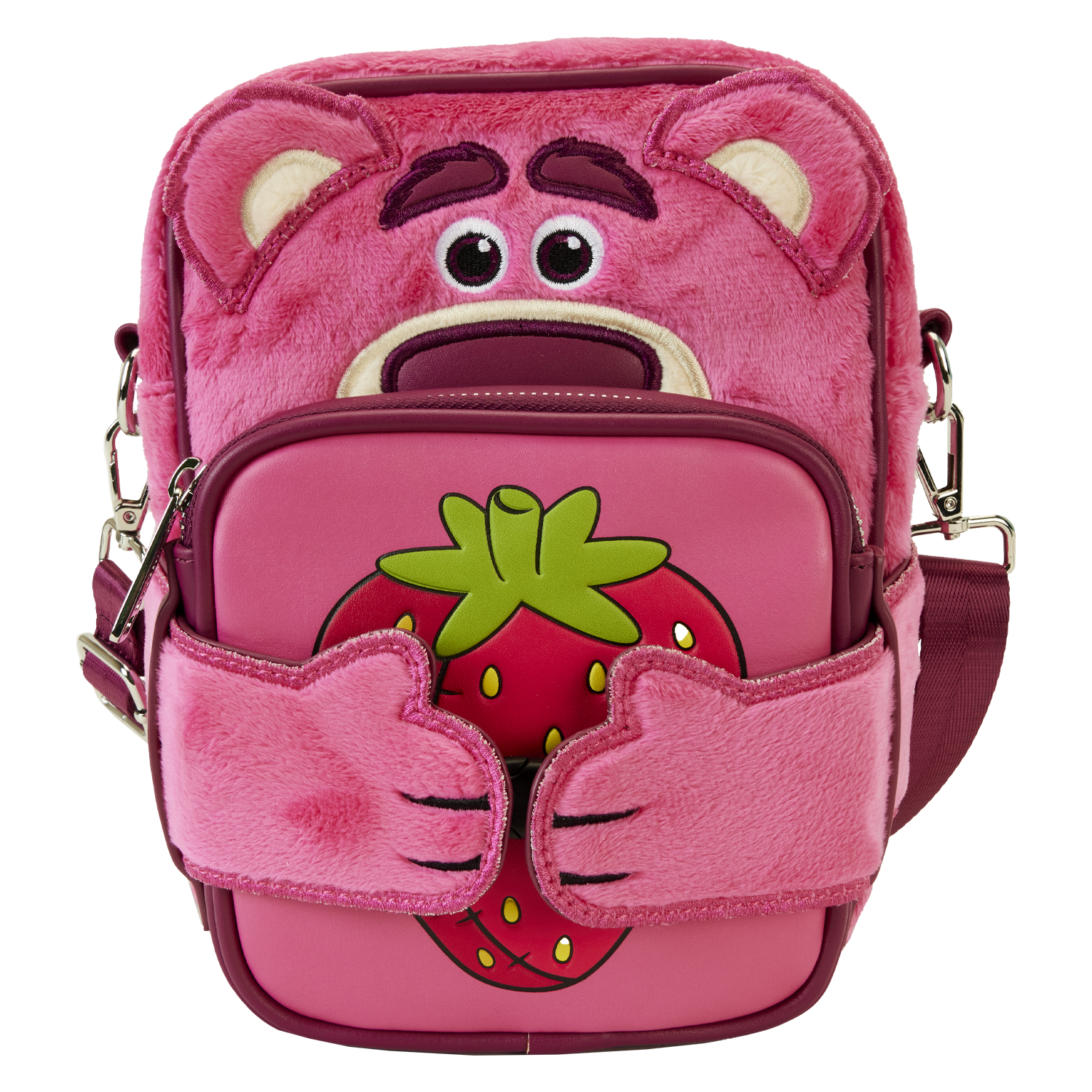 This cuddly teddy bear is monstrously cute! Bring this fuzzy friend along on your next adventure with the Loungefly Toy Story Lotso CROSSBUDDIES Bag. On the front, Lots-o'-Huggin' Bear takes shape with soft plush details and embroidered facial features. Down below, Lotso holds a strawberry on a detachable coin bag. Unbuckle his arms to change the coin bag's reversible design to the Sunnyside Day Care logo! This crossbody bag has room for all your playdate essentials and is the perfect accessory for kids at heart.