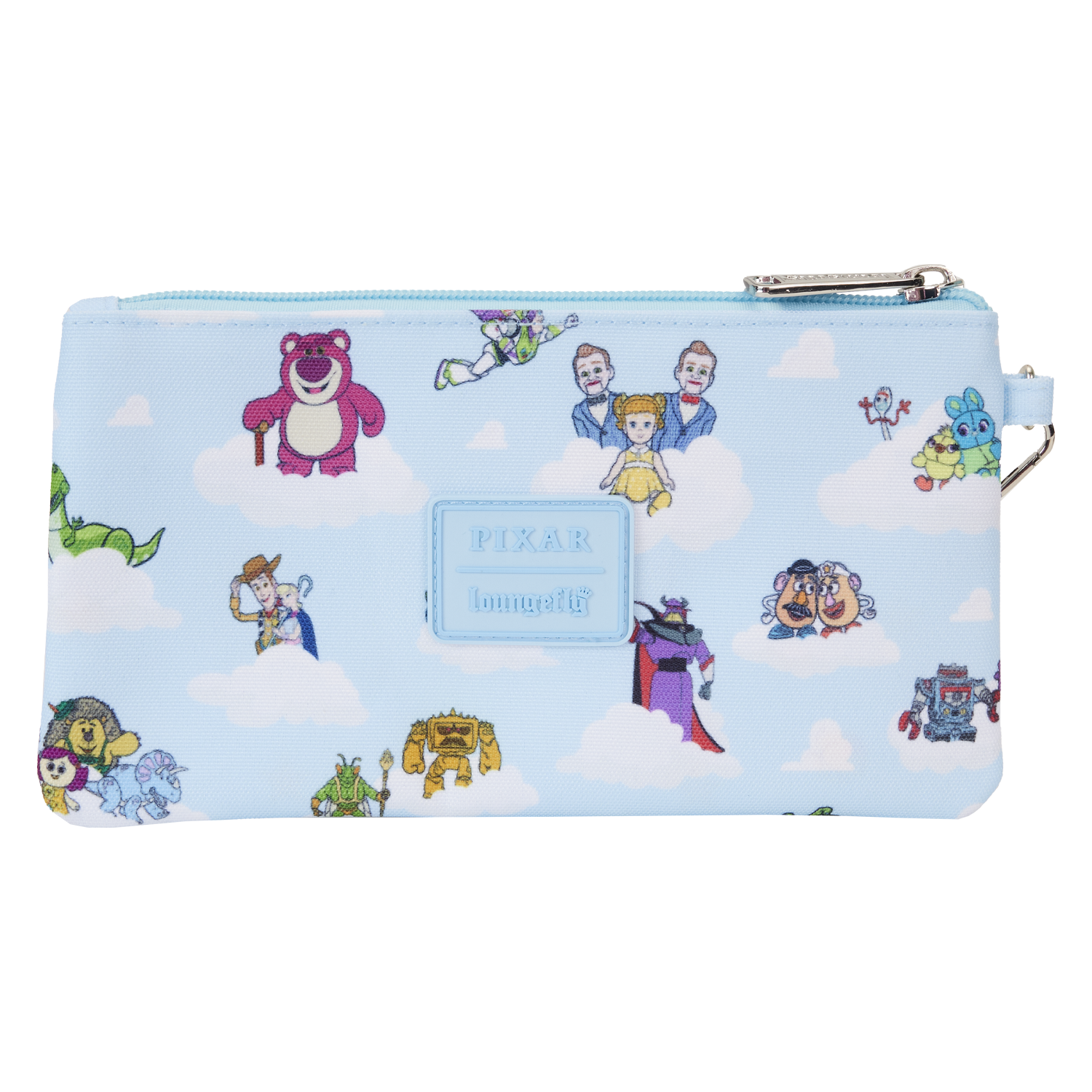 Round up your pals, it's time to play! The Loungefly Toy Story Movie Collab AOP Nylon Wristlet Wallet unites our favorite toys from across the Disney-Pixar franchise. Covered in a bright all-over print, this accessory shows characters from Toy Story and its following sequels. Andy's bedroom wallpaper appears in the background while the toys float by on their own fluffy clouds. This wristlet wallet has room for all your playdate essentials and is the perfect accessory for kids at heart.